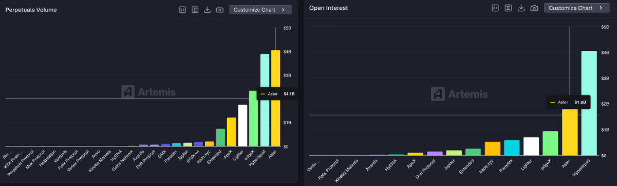 Aster – sàn giao dịch phi tập trung (DEX) được hậu thuẫn bởi các nhà đầu tư chiến lược, trong đó có YZi Labs – đang bất ngờ trở lại tâm điểm chú ý của giới đầu tư nhỏ lẻ trong vòng 24 giờ qua, qua đó gia tăng áp lực cạnh tranh trực tiếp lên Hyperliquid. Dữ liệu từ Artemis cho thấy khối lượng giao dịch hợp đồng vĩnh cửu (perpetuals) trên Aster đạt 4,1 tỷ USD, vượt qua con số 3,9 tỷ USD của Hyperliquid trong cùng kỳ.