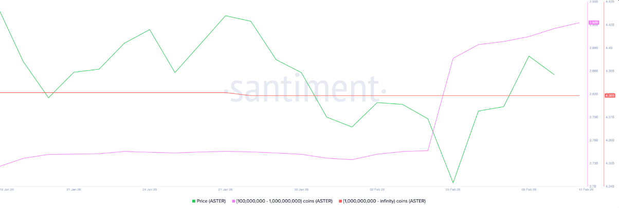 Ở góc độ on-chain, cấu trúc phân bổ nguồn cung ASTER phản ánh sự quay trở lại đáng chú ý của nhóm cá voi nắm giữ từ 100 triệu đến 1 tỷ token. Theo Santiment, nhóm này đã gia tăng tổng lượng nắm giữ lên khoảng 9,75 tỷ USD vào thứ Năm, so với mức 9,22 tỷ USD trước đó – động lực quan trọng củng cố kịch bản phục hồi hình chữ V của ASTER.