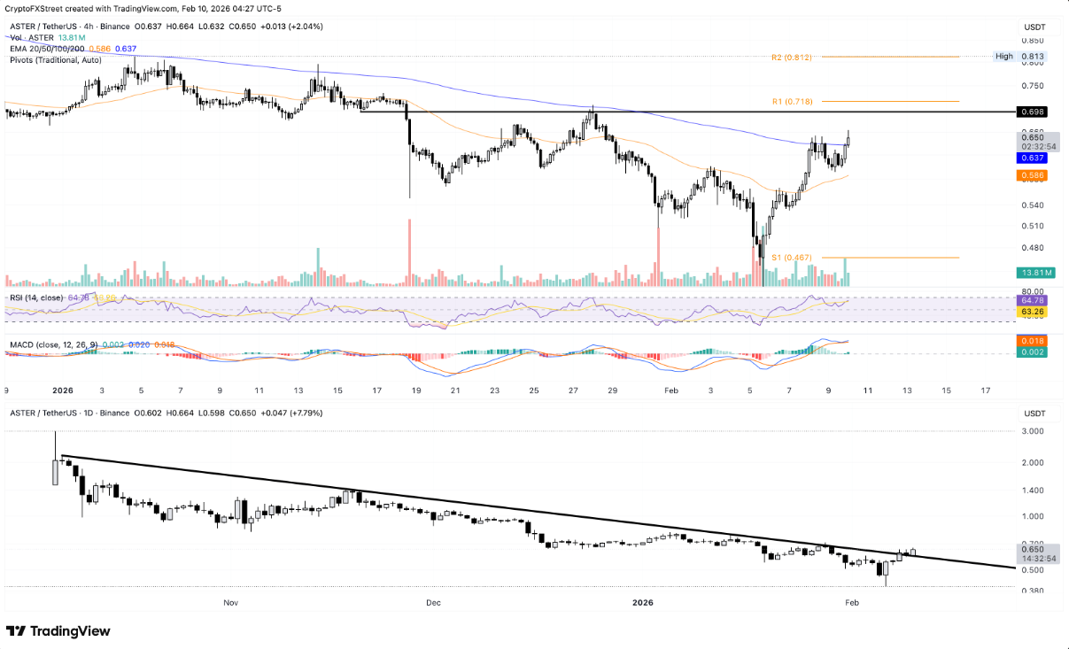 Trên khung thời gian 4 giờ, ASTER đã bứt lên trên đường EMA 200 kỳ tại 0,637 USD, trong khi EMA 50 kỳ tiếp tục hướng lên, phản ánh sự duy trì của xu hướng tăng trong ngắn hạn. Dẫu vậy, áp lực cản vẫn hiện hữu khi giá đang tiến vào vùng kháng cự đáng chú ý trải dài từ 0,698 USD — đáy cũ ngày 26/1 — đến điểm Pivot R1 tại 0,718 USD.
