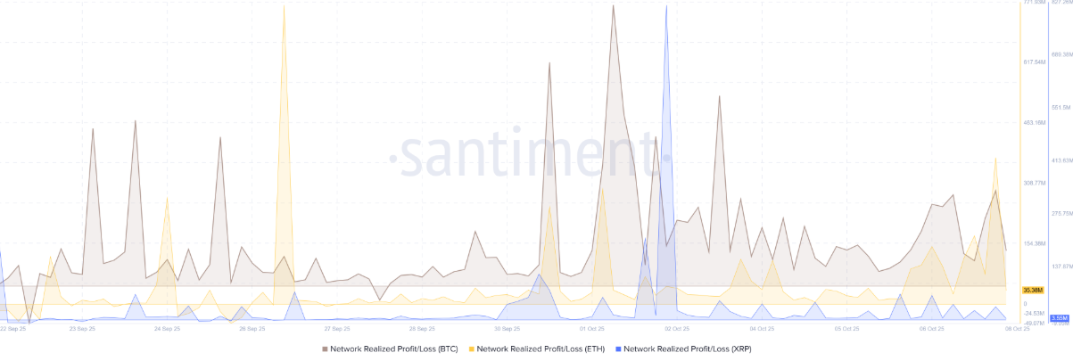Theo ghi nhận, chỉ báo này đã tăng mạnh vào thứ Hai đối với cả BTC, ETH và XRP, cho thấy phần lớn nhà đầu tư đang hiện thực hóa lợi nhuận đáng kể — qua đó gia tăng áp lực bán lên thị trường.