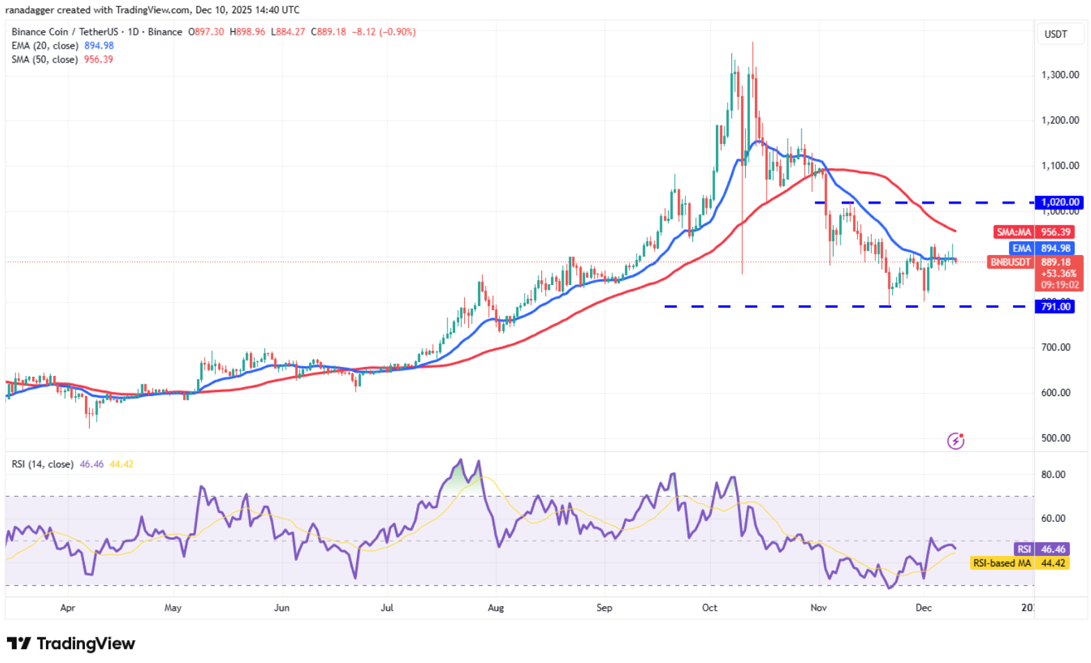 Đường EMA 20 ngày phẳng và RSI nằm ngay dưới điểm giữa cho thấy sự cân bằng giữa cung và cầu. Cặp BNB/USDT có thể dao động trong khoảng $791–$1.020 trong vài ngày tới.