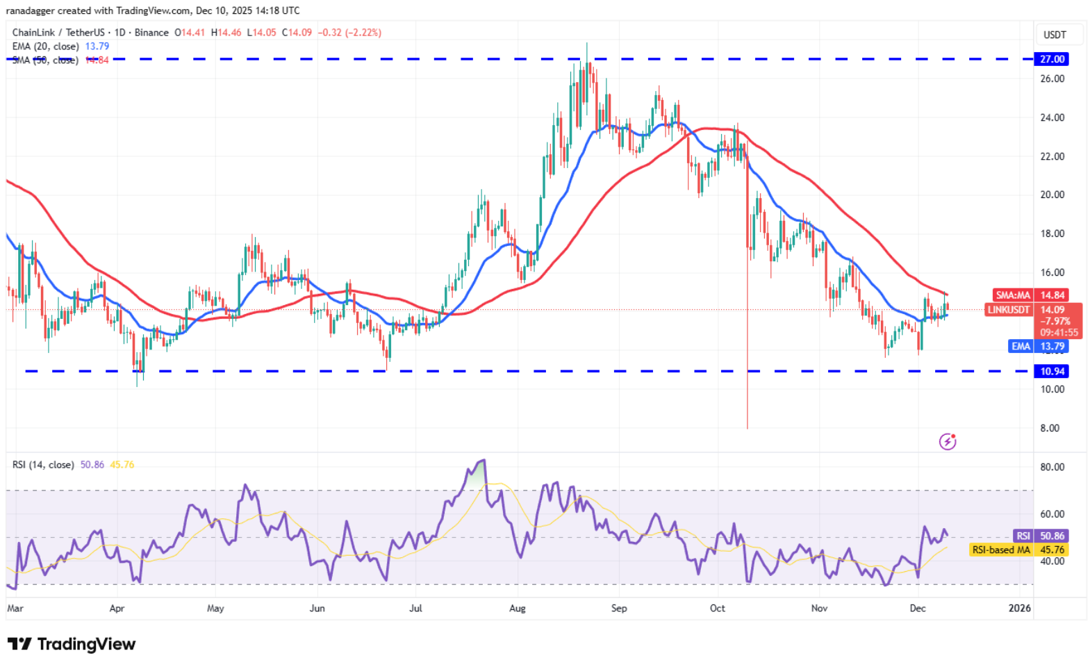 Sự phục hồi của Chainlink (LINK) đang gặp áp lực bán tại đường SMA 50 ngày ($14,84), cho thấy phe gấu đang hoạt động ở các mức giá cao hơn.