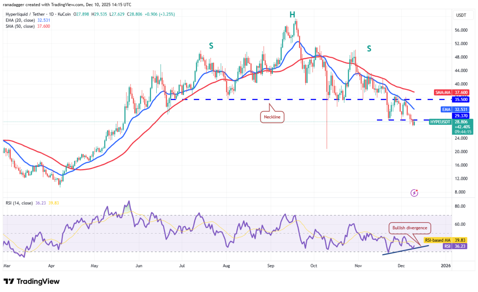 Chỉ số RSI đang cho thấy dấu hiệu sớm của một phân kỳ tăng, báo hiệu áp lực bán đang giảm. Cặp HYPE/USDT dự kiến sẽ mạnh lên nếu người mua đẩy giá vượt qua đường EMA 20 ngày ($32,53).