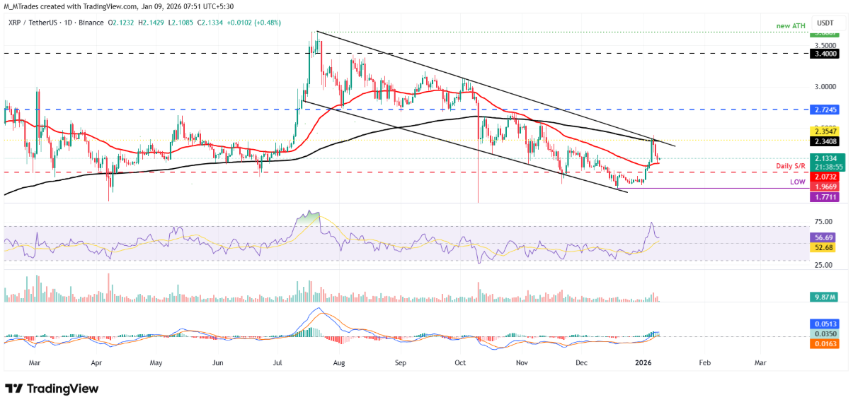 Tuy nhiên, rủi ro điều chỉnh vẫn hiện hữu: nếu XRP đóng cửa dưới đường EMA 50 ngày tại 2,07 USD trên khung thời gian ngày, áp lực bán có thể gia tăng, kéo giá trượt về vùng hỗ trợ thấp hơn quanh 1,96 USD.