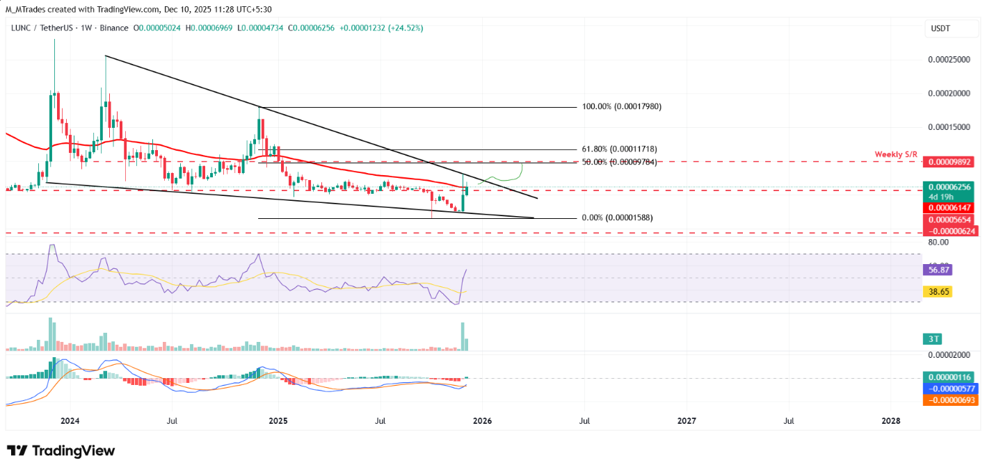 Nếu LUNC đóng nến tuần trên đường EMA 50 tuần (0,000056 USD), đà tăng có thể mở rộng hướng đến kháng cự tiếp theo ở 0,000098 USD.