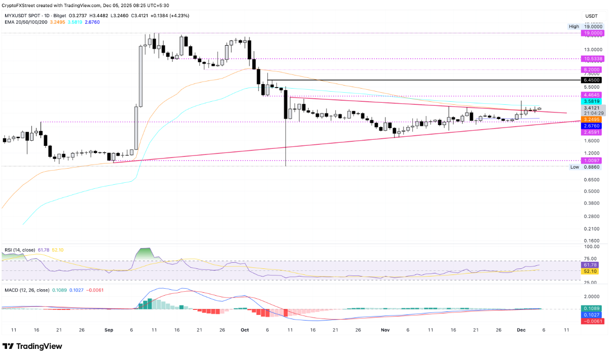 Ở kịch bản điều chỉnh, MYX có các vùng hỗ trợ đáng chú ý tại đường EMA 50 ngày quanh 3,24 USD, sâu hơn là EMA 200 ngày ở 2,67 USD.