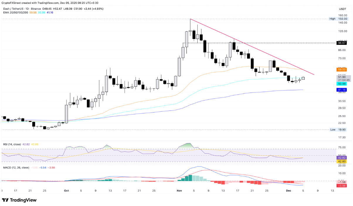 Dash đang nối dài chuỗi phục hồi sang phiên tăng thứ ba liên tiếp, với tâm điểm hướng tới việc chinh phục đường EMA 100 ngày tại mốc 50,98 USD. Tại thời điểm ghi nhận, DASH giao dịch quanh ngưỡng 52,00 USD, tăng khoảng 5% trong phiên thứ Sáu.