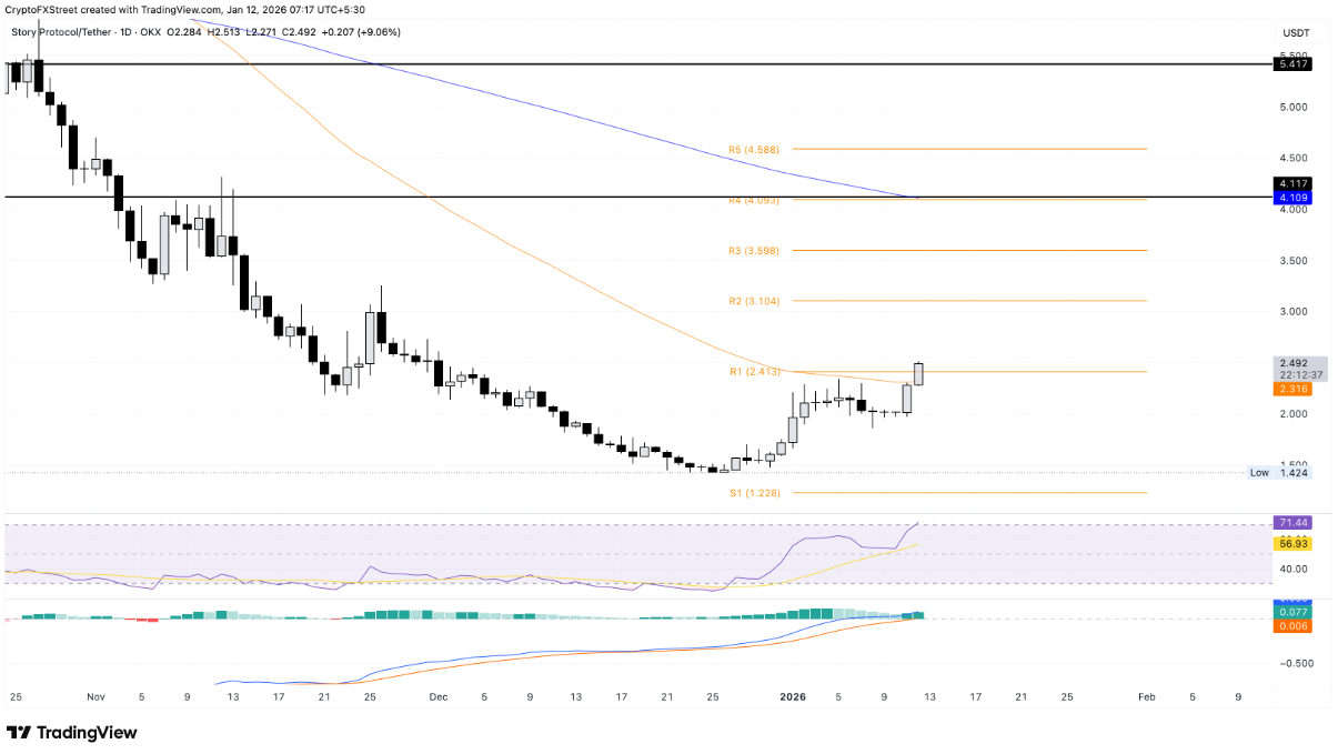 Story ghi nhận mức tăng 9% vào thời điểm viết bài trưa thứ Hai, tiếp tục trụ vững trên đường trung bình động hàm mũ (EMA) 50 ngày tại 2,31 USD sau cú bứt phá 13% đầy ấn tượng hôm Chủ nhật. Đà hưng phấn giúp đồng coin này vượt qua Điểm Pivot R1 ở 2,41 USD và hiện đang áp sát ngưỡng kháng cự quan trọng 2,50 USD.